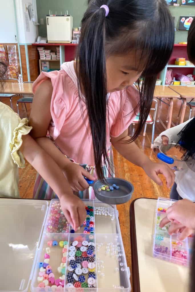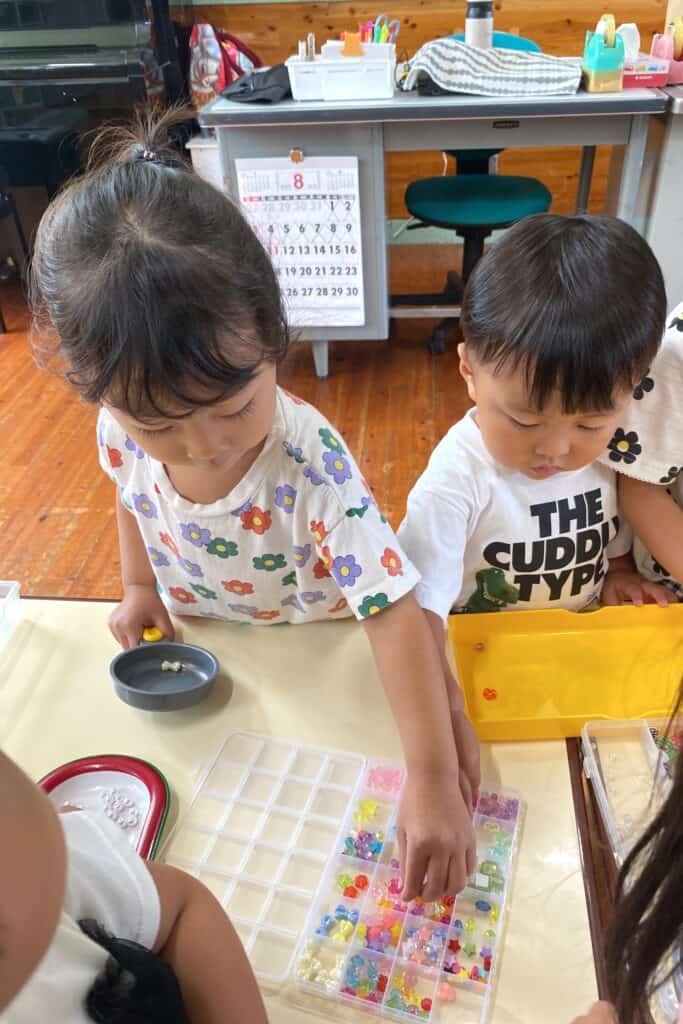 好きなビーズやスパンコールを選んで、一人ひとりオリジナルの物が完成しました。