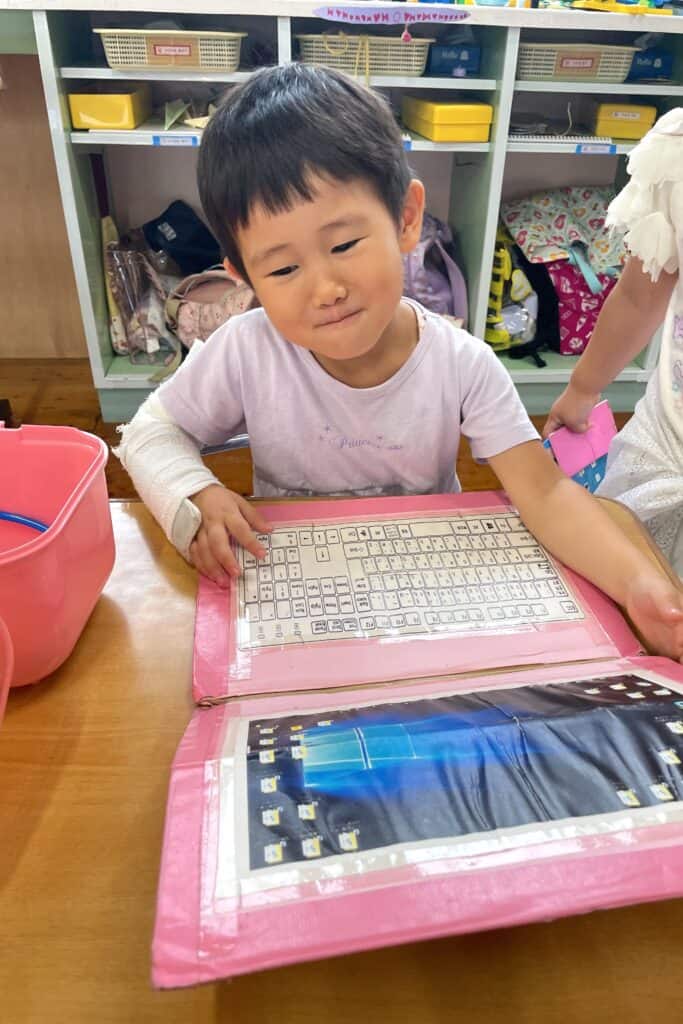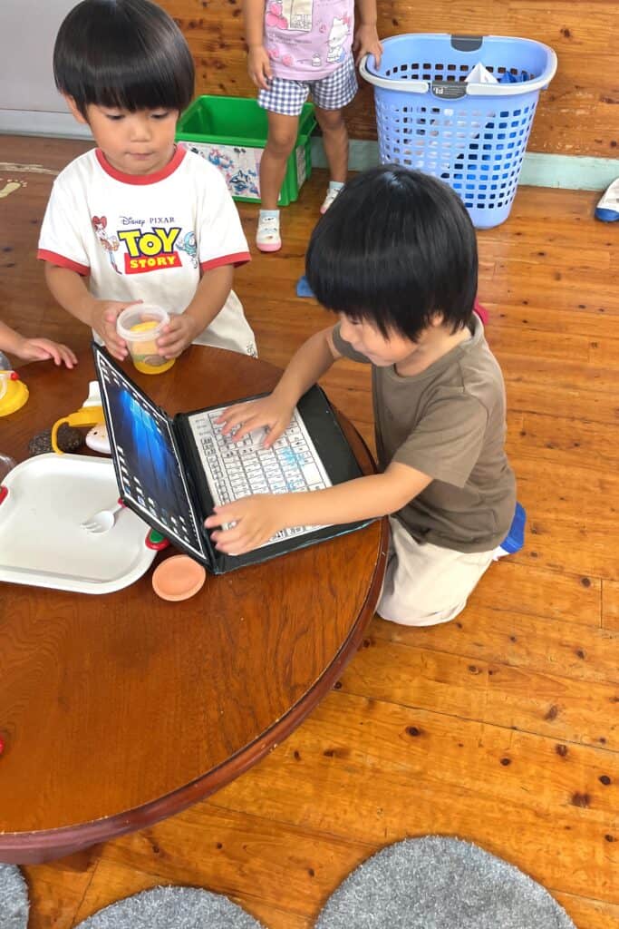 手作りタブレットやノートパソコンで職員のまね?をしたり、