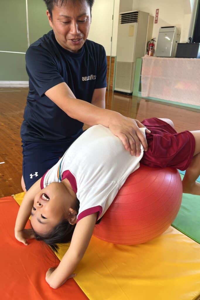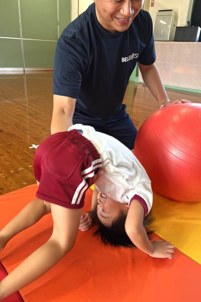 今日は、前転からのブリッジ!バランスボールを使って後転をしました!