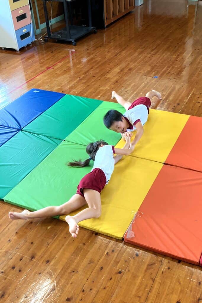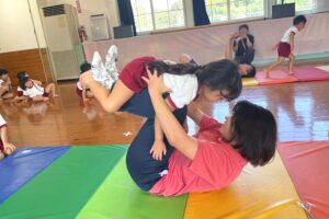 運動遊びでは、ブリッジに挑戦したり、先生のくるりんぱでバク宙を楽しんだり、最後は、大根抜きで盛り上がりました😊!!