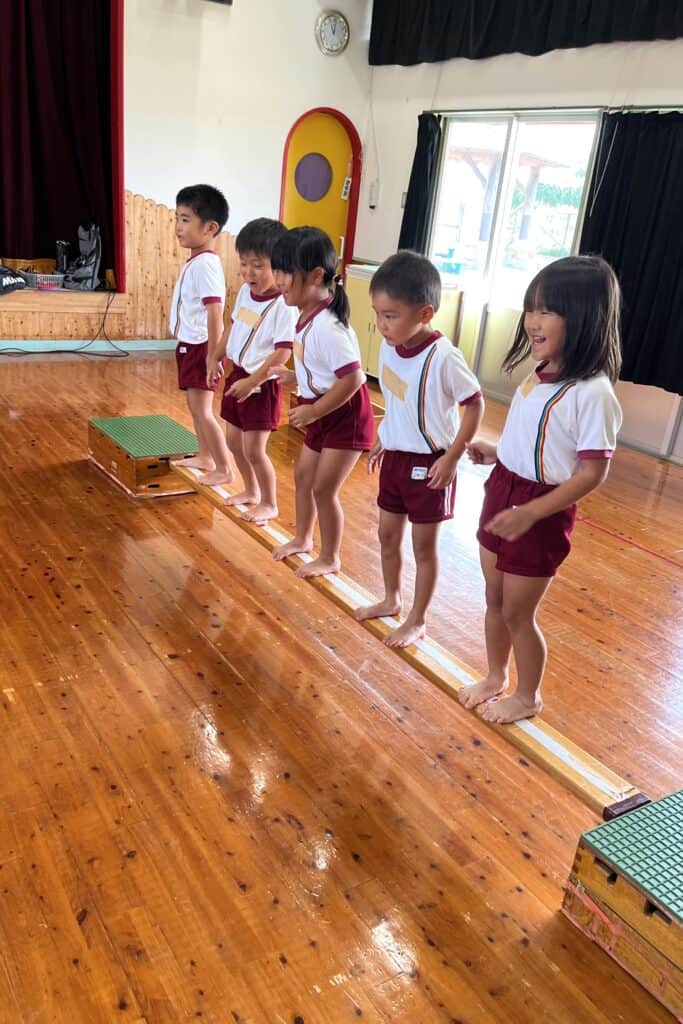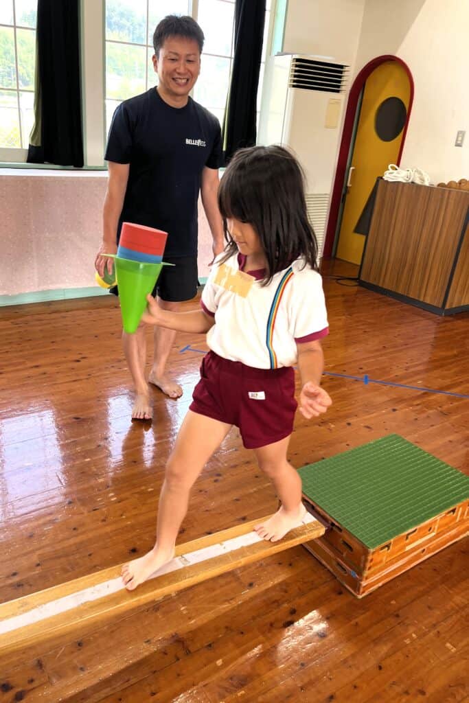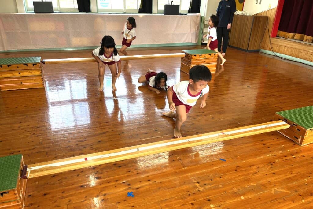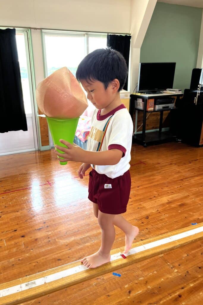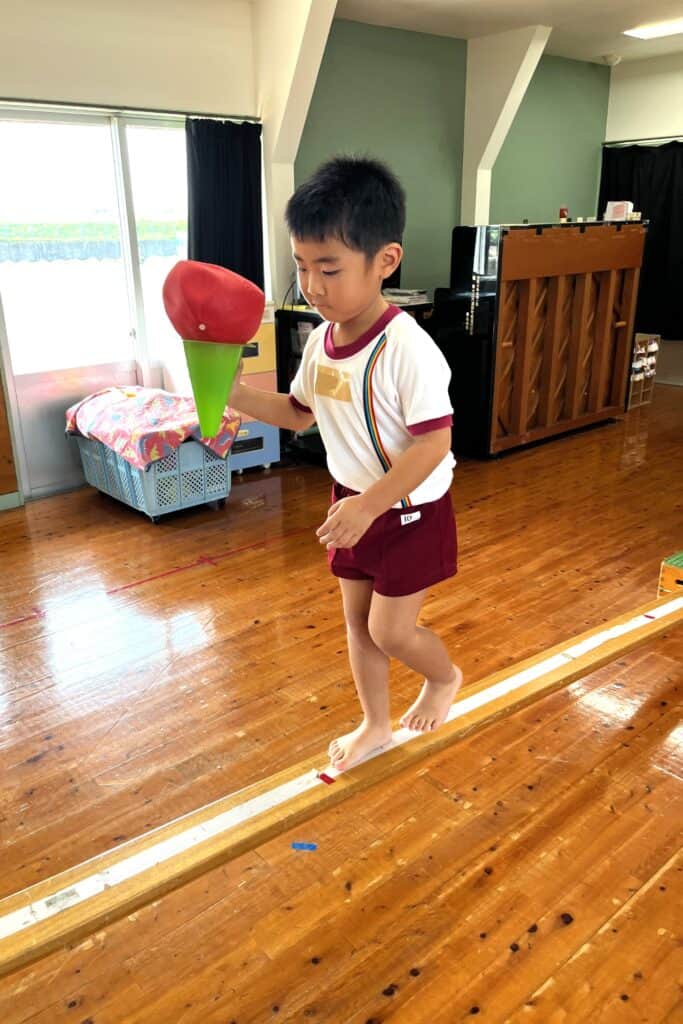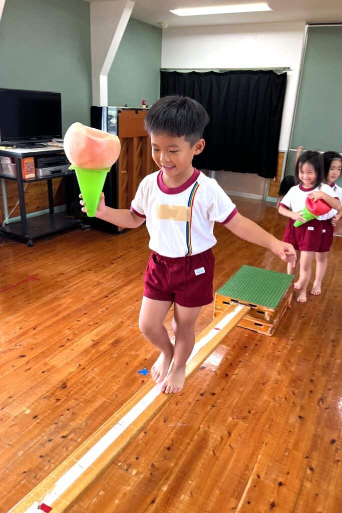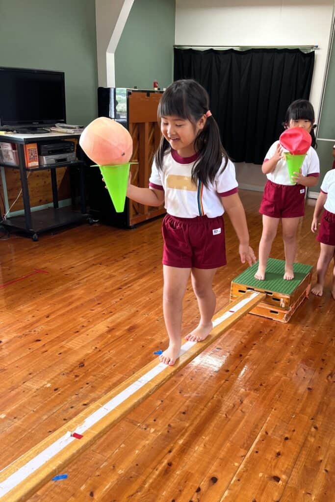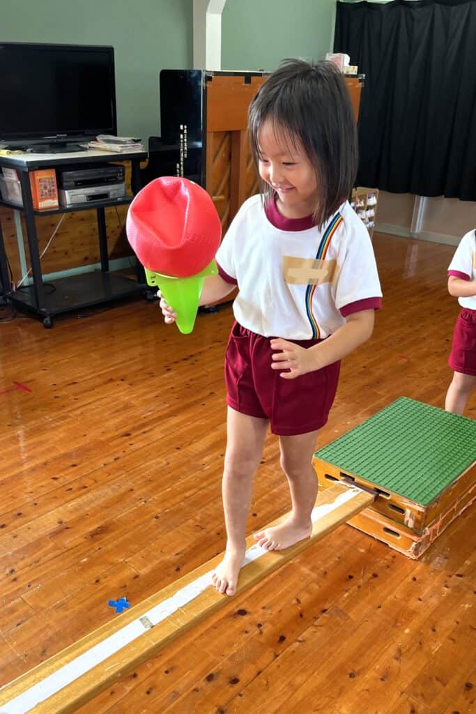 傾斜をつけて渡ったり、三角コーンにボールを乗せて渡ったり、ジャンプして平均台に乗ったりと色々な動きに挑戦しました💪✨