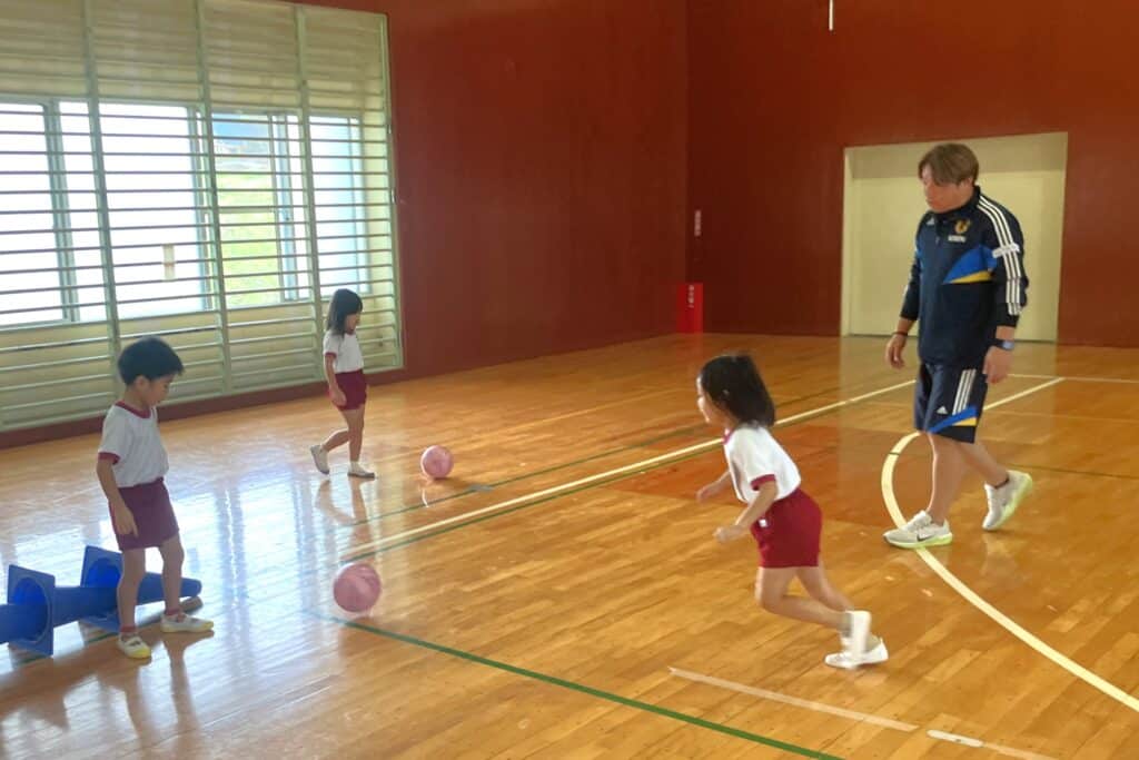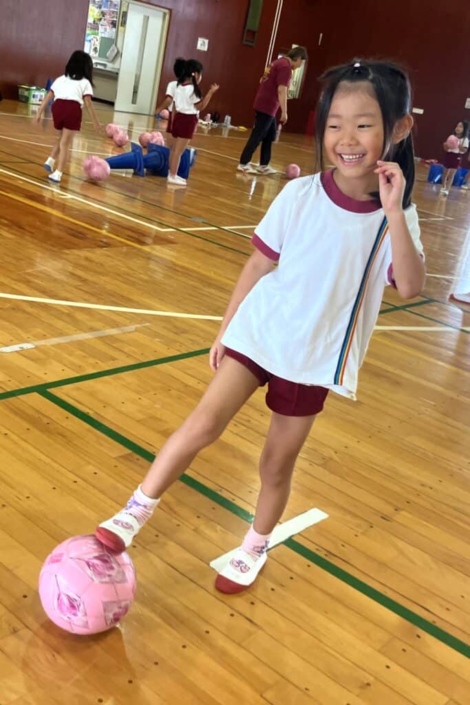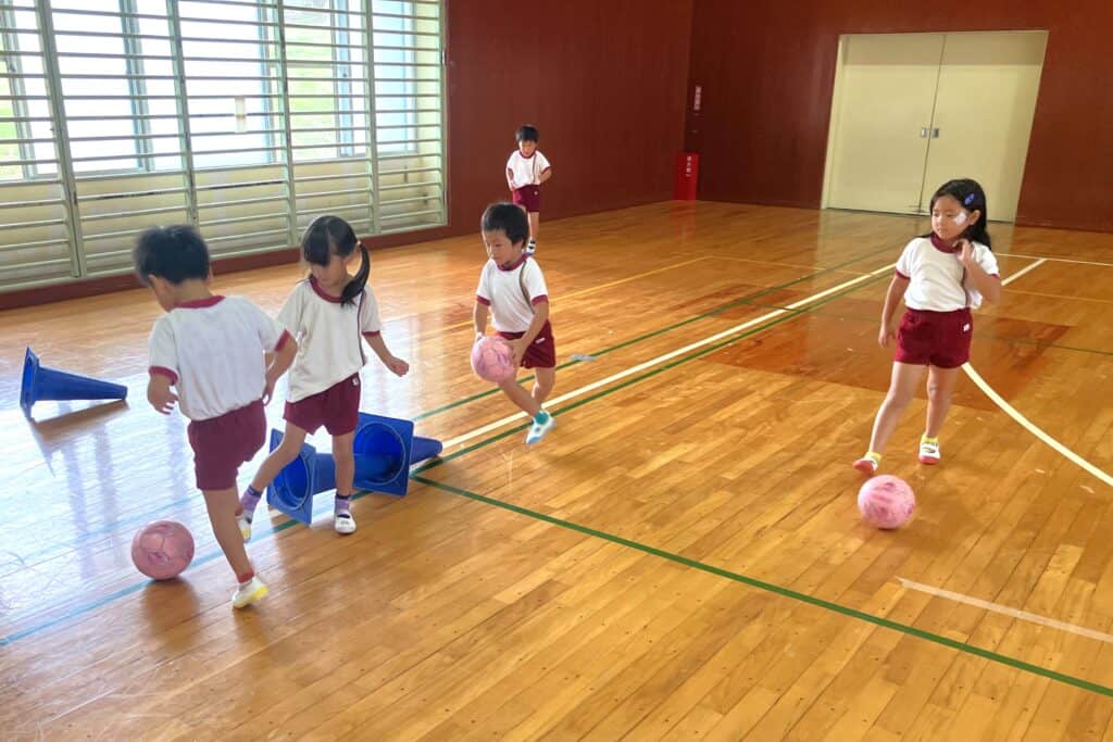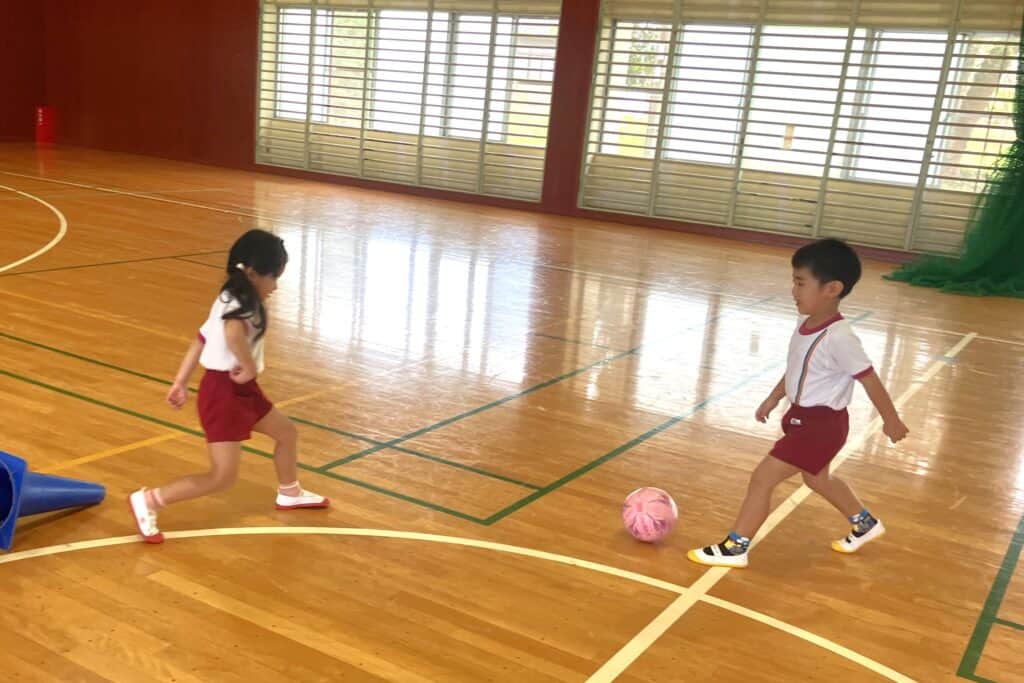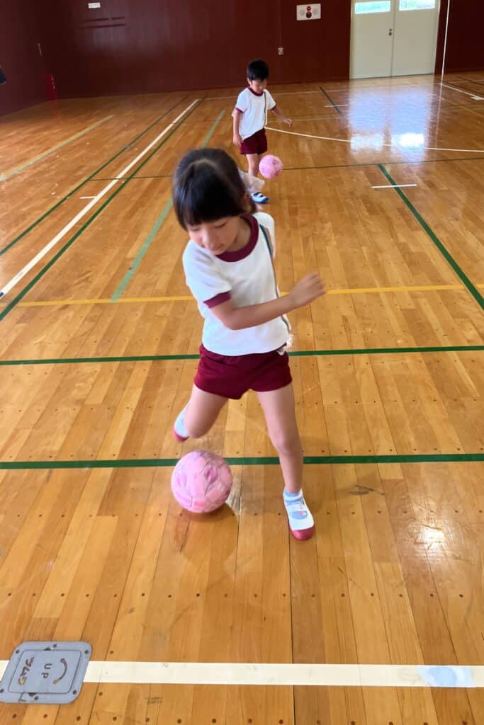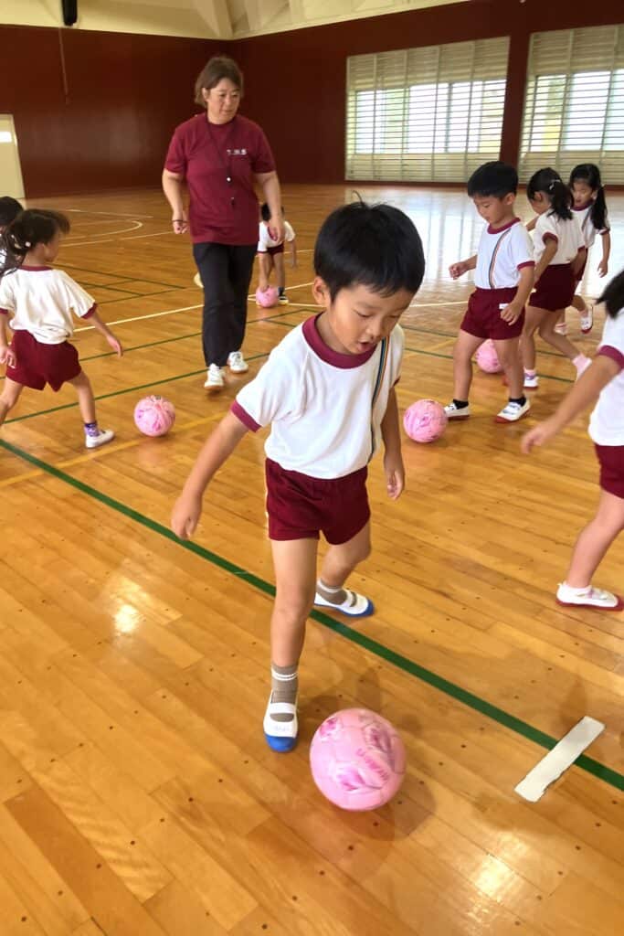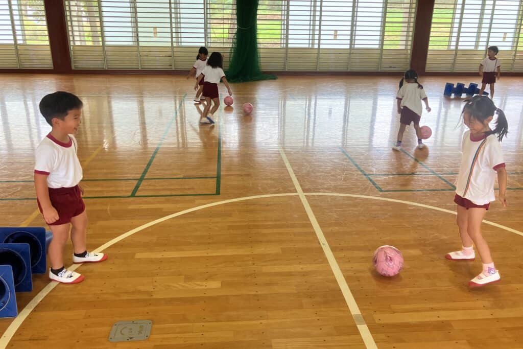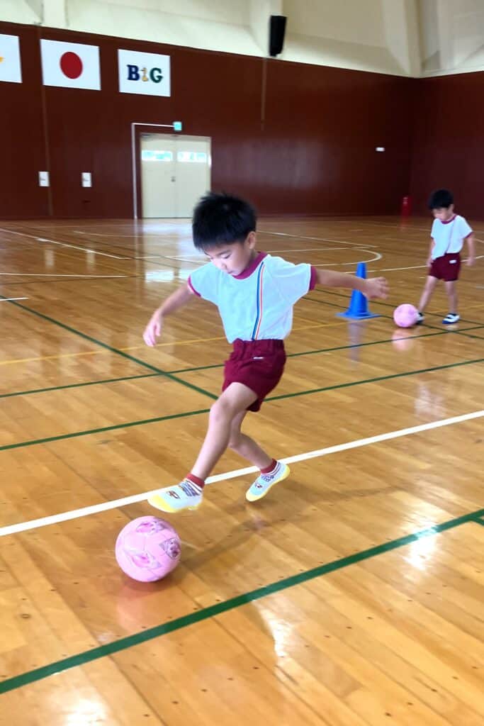 園庭のコンディションが悪かったので、B&G体育館でキッズサッカーを行いました!!