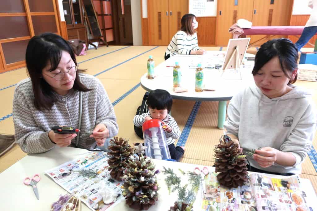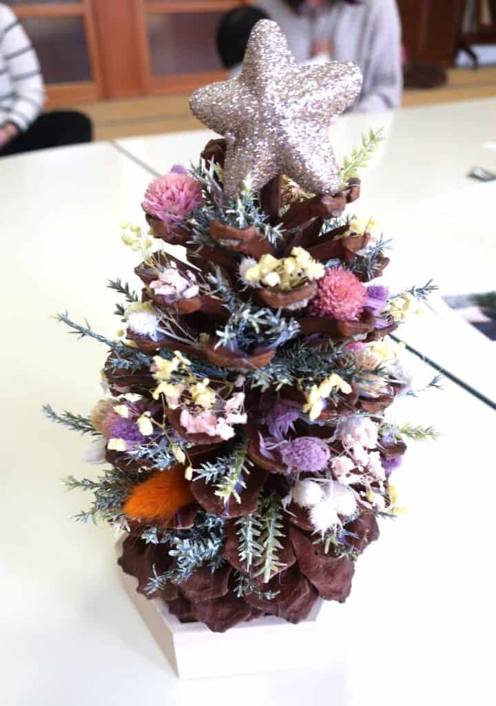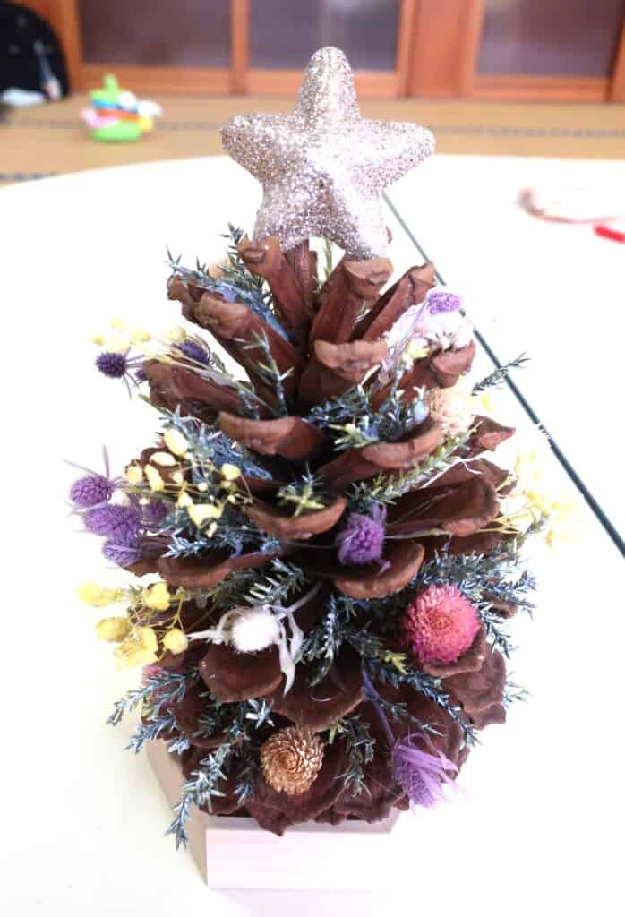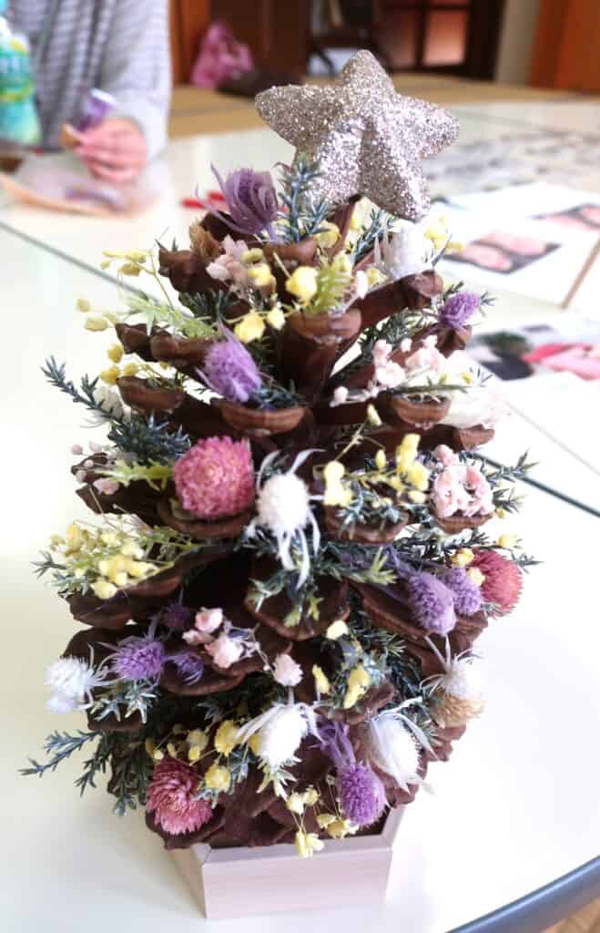 今回は、順番を待っている間に『 まつぼっくりのクリスマスツリー🎄』も作ってもらいました ✨大きなまつぼっくりに、造花やドライフラワーなどを飾りました😊