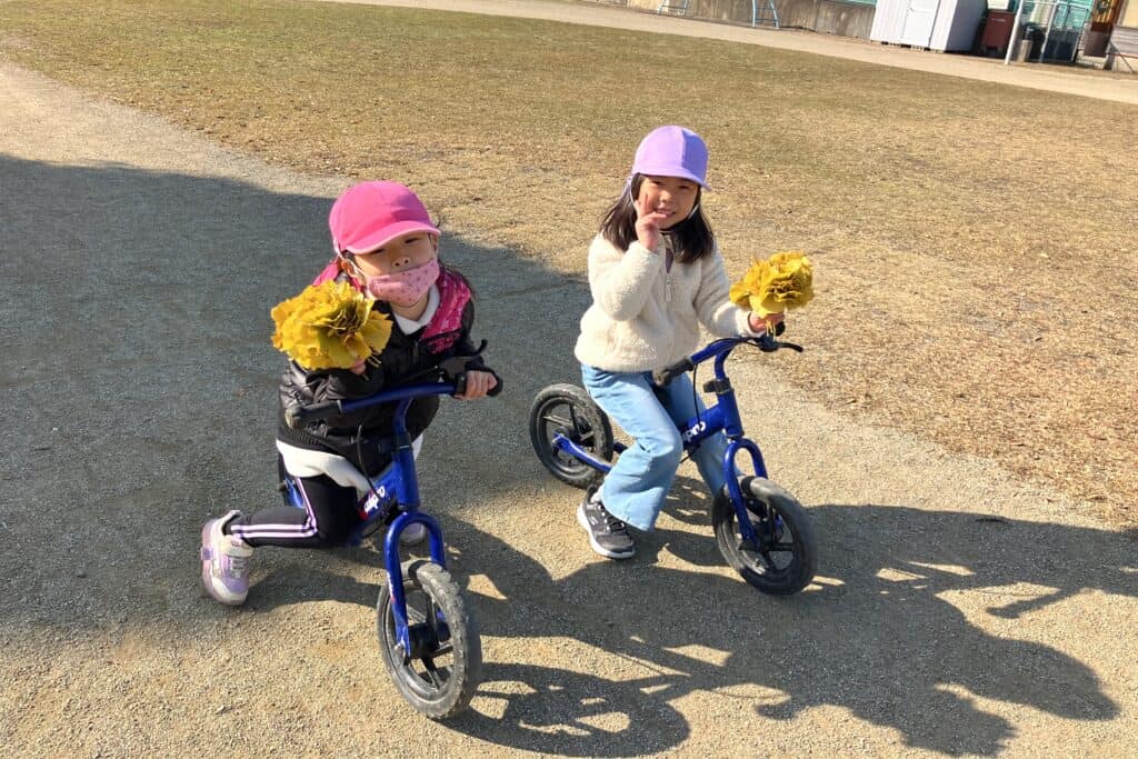 「寒い時こそ、縮こまらず走ったり、登ったり体を動かしたら体がポカポカになるよ~😍」と声を掛けると、みんな元気に走る!三輪車やブランコをこぐ!
