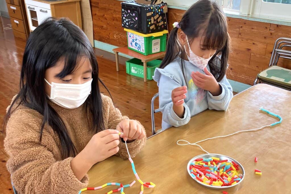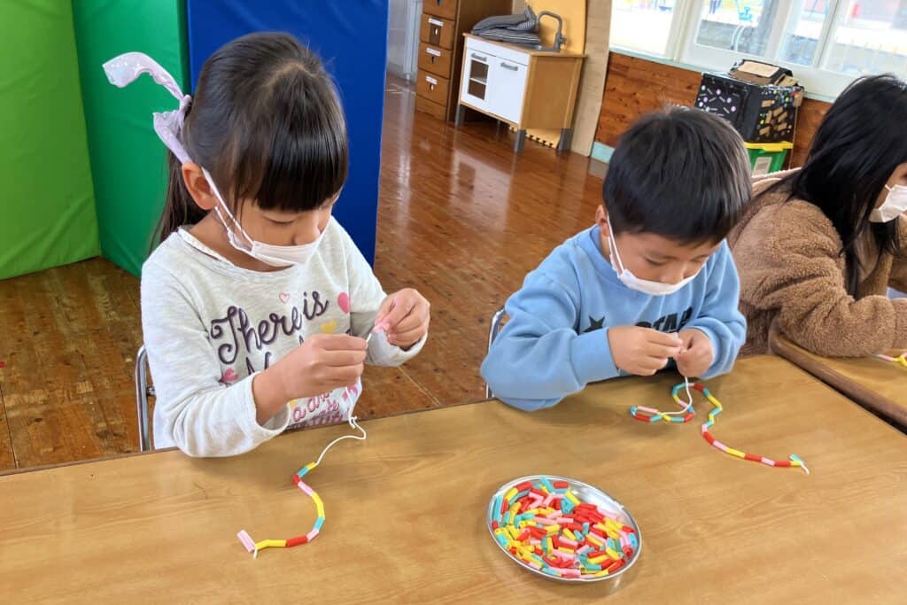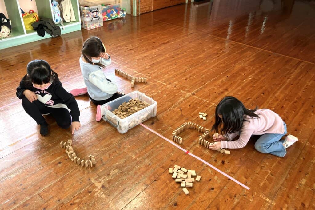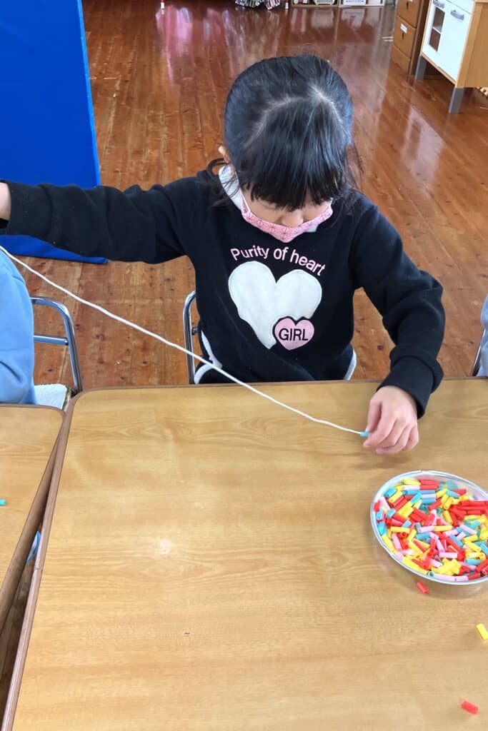 室内では文字遊びや紐通し、ドミノ倒しと好きな遊びを選んでみんな集中して楽しんでいました😊