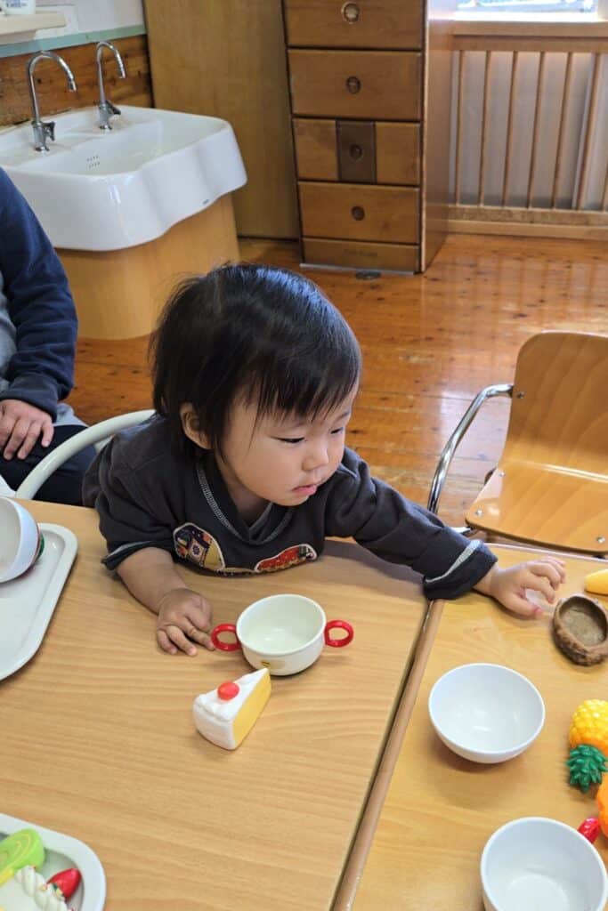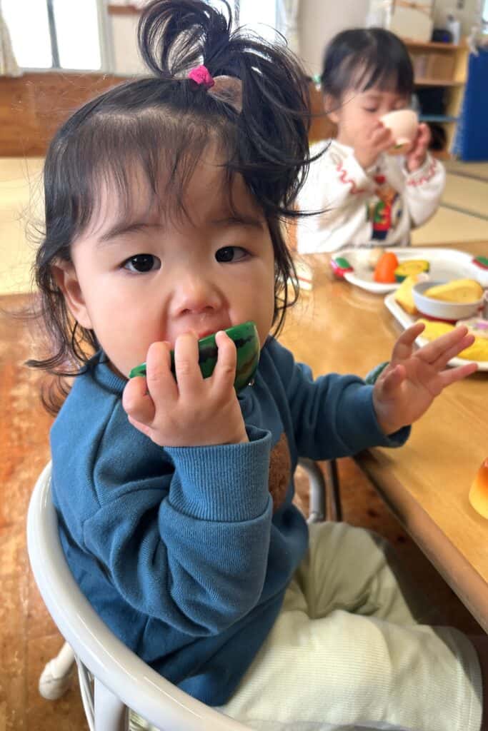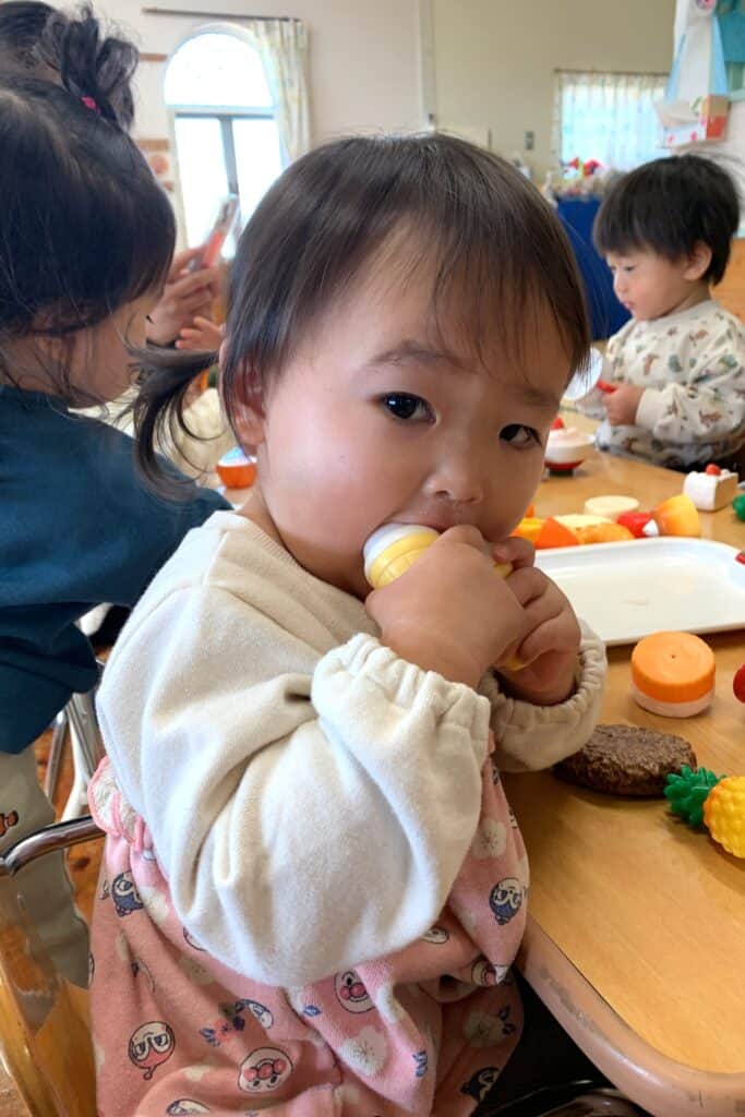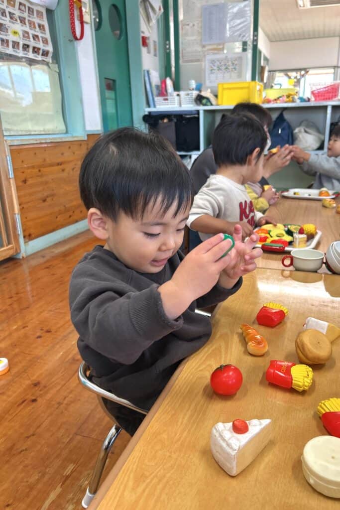 「はいどうぞ〜」と保育者にランチプレートを作ってくれたり、お友だちと「はい!あ~ん!!」と食べさせあいっこをしたりとままごと遊びを楽しむ子ども達でした!!