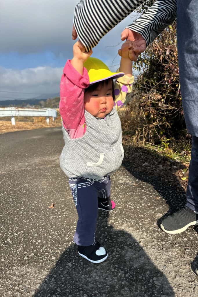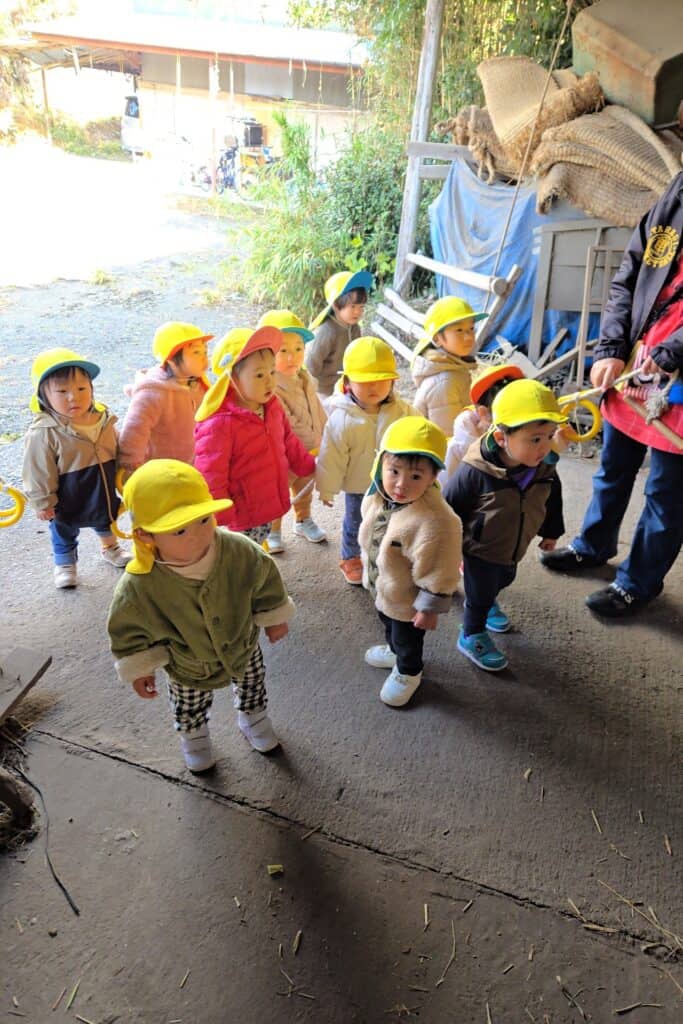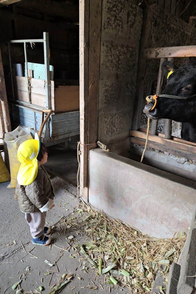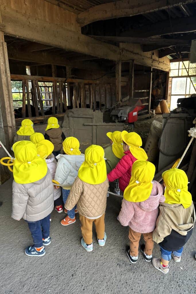 誘導ロープを握ってのお散歩も上手になったたんぽぽ組さん達です!頑張って歩いて牛さんのお家に到着✨
