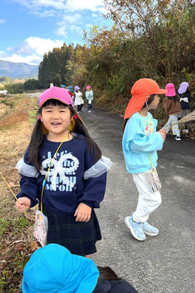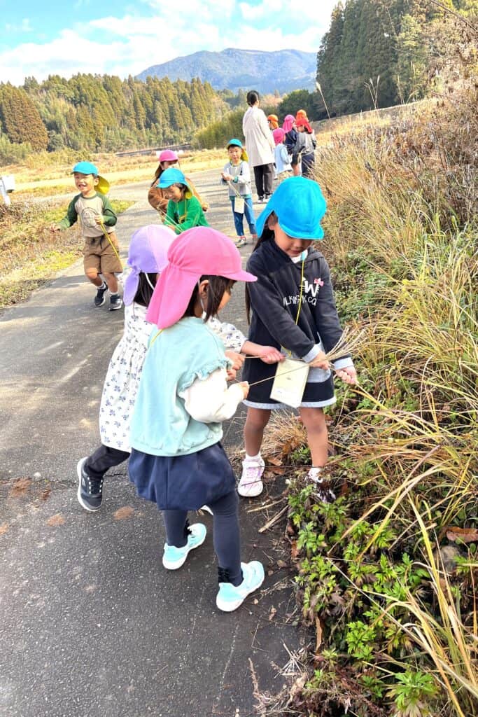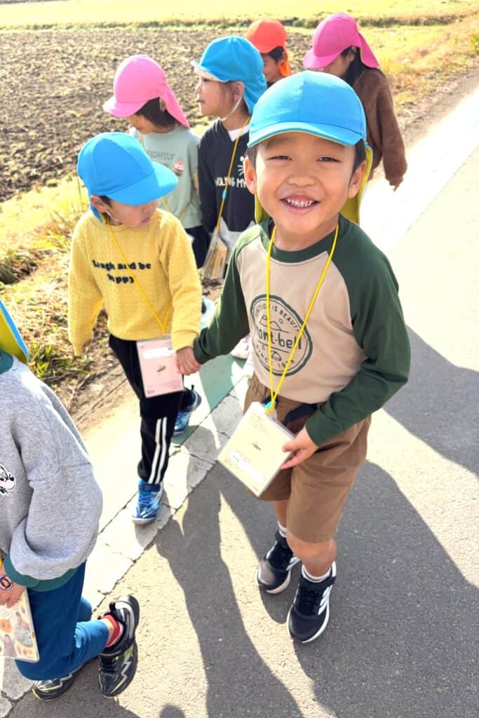途中で見た洋服を着たヤギには 「かわいい~🥰」と笑い声が上がってました🎶自由散策では、草を取ってお友達と絡ませて綱引きをしてみたり、道端のススキ取りをしてお土産にしたりと1時間楽しく歩いてきました😁👍