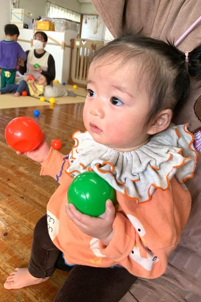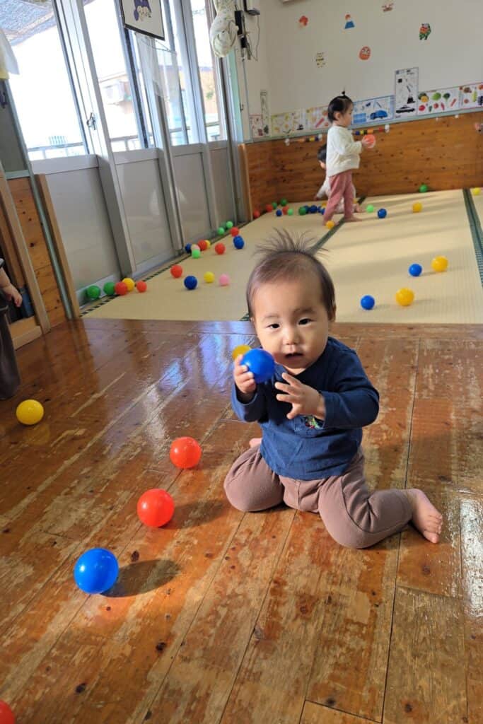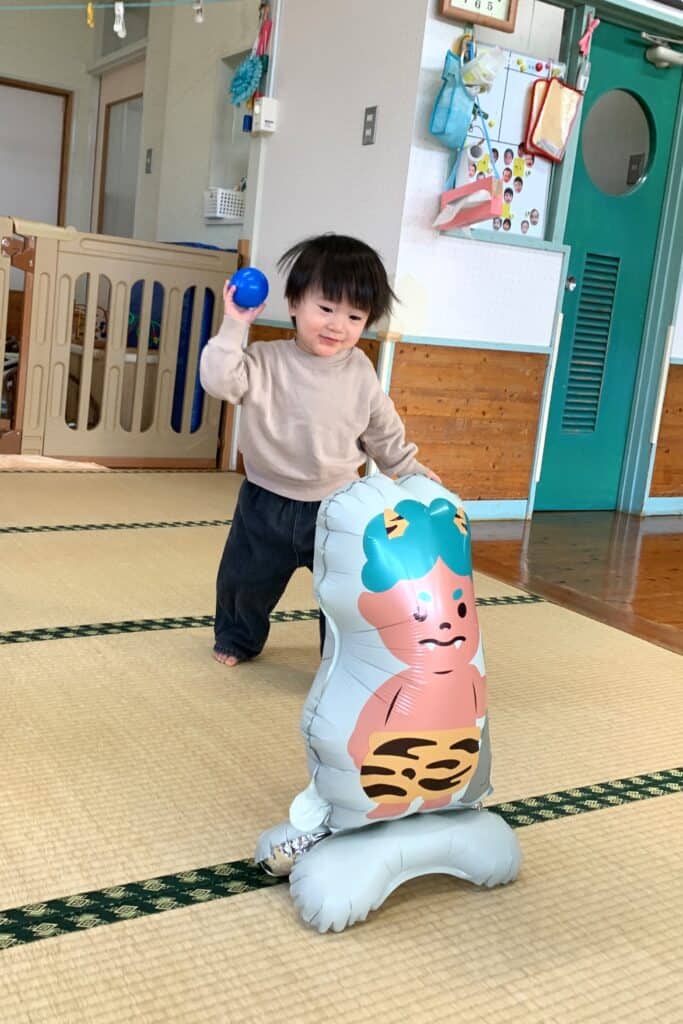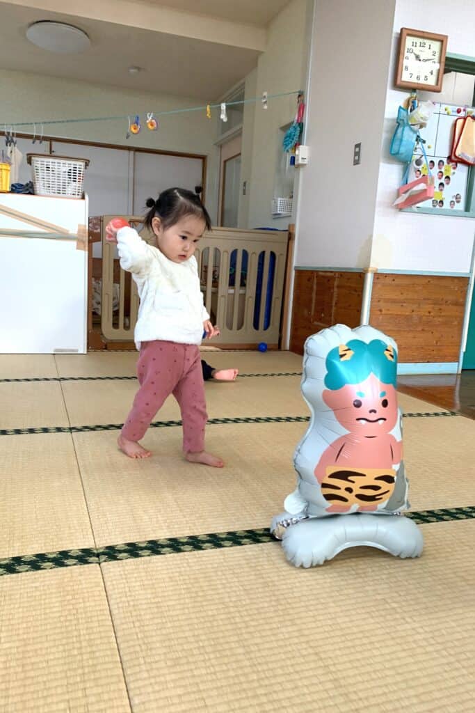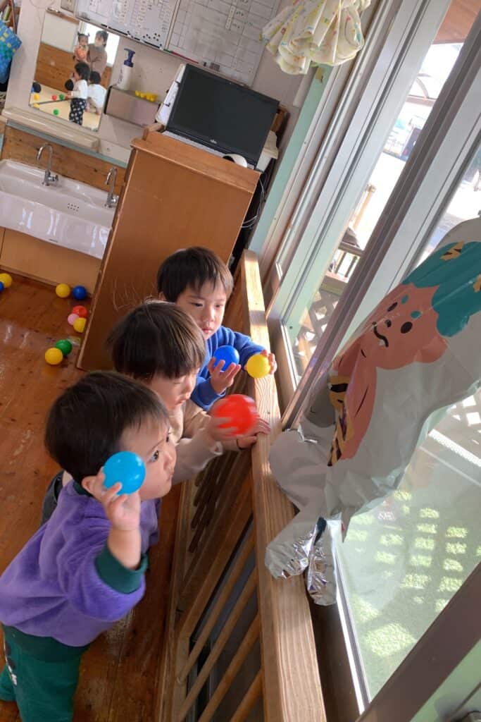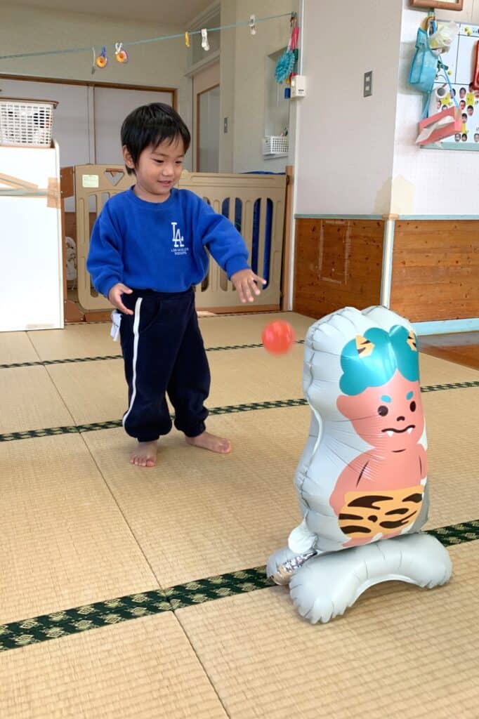「えいっ!」と元気にボールを投げて、鬼さんが倒れると嬉しそうな子ども達でした😆